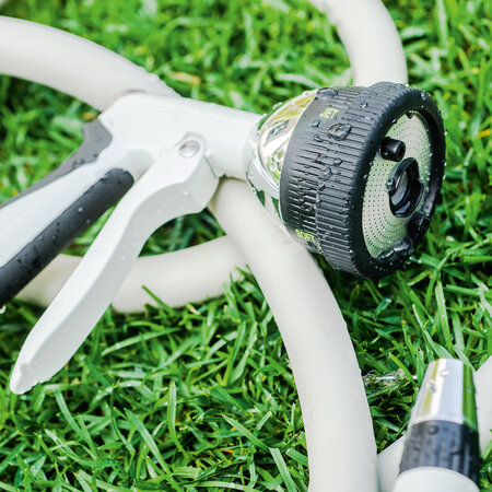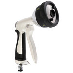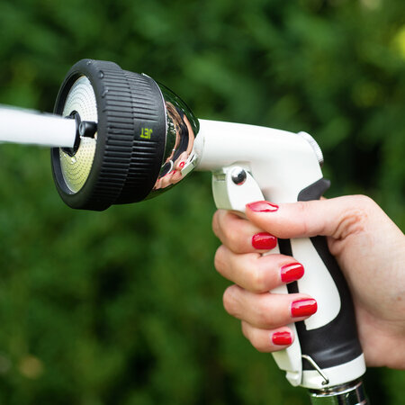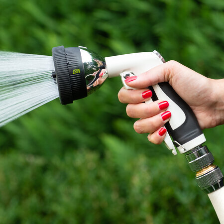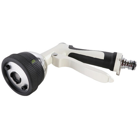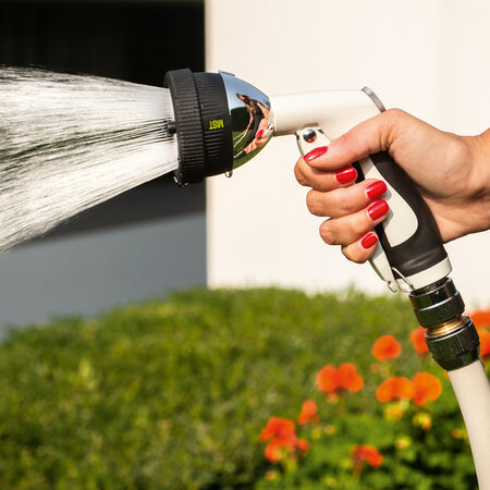 Die Wasserpistole ist für unterschiedliche Bewässerungs- und Reinigungsaufgaben geeignet, denn sie bietet vier verschiedene Sprühbilder. Vom feinen Sprühstrahl, über einen sanften Brause- und Perlstrahl zur Bewässerung bis hin zu einem Vollstrahl für die effektive Reinigung. Die lackierte Metallkonstruktion macht die robuste Wasserpistole zu einem langlebigen Produkt . Der ergonomische Handgriff mit Gummi-Ummantelung sorgt für grösstmöglichen Komfort während des Gebrauchs. Der Wasserdurchfluss kann stufenlos angepasst werden. Für die dauerhafte Bewässerung kann der Fronthebel arretiert werden, so vermeiden Sie, dass Ihre Hand ermüdet.