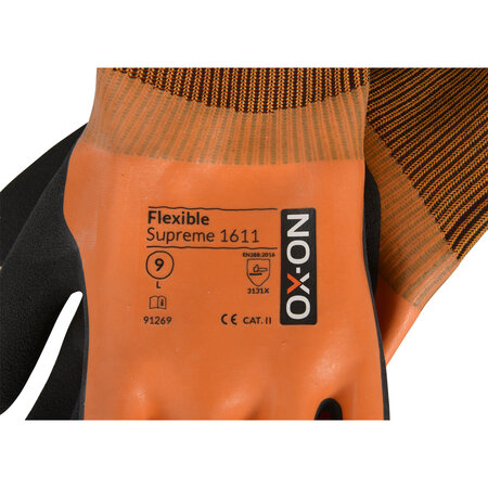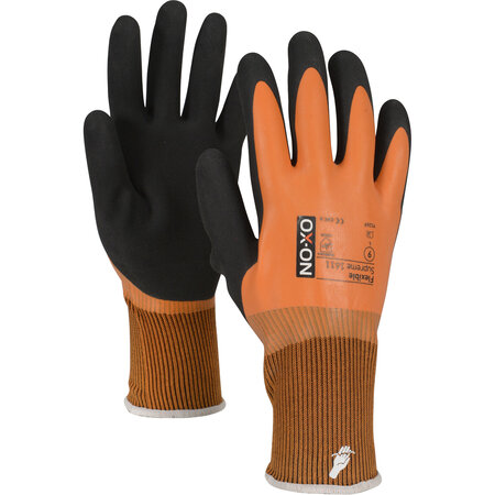 Der OX-ON Flexible Supreme 1611 ist ein zu 100 % wasserdichter Handschuh für Arbeiten in den Bereichen Maurerhandwerk und Bauwesen, Gerüstbau, Gartenbau und Renovierung. Der Handschuh weist eine hervorragende Passform und ein sehr gutes Fingergefühl auf. Es ist vielseitig verwendbar bei gleichzeitig hervorragendem Halt – sowohl bei Nässe wie auch Trockenheit. Das macht diesen Handschuh zur perfekten Wahl für selbst schwierigste Aufgaben. Der OX-ON Flexible Supreme 1611 ist ein extrem weicher und bequemer Handschuh mit doppelter Latexbeschichtung: Die orange Innenbeschichtung hält die Hände trocken. Die schwarze Außenbeschichtung ermöglicht außergewöhnlich guten Halt. Das Strickgewebe aus Acryl und Polyester macht den Handschuh weich und angenehm zu tragen.