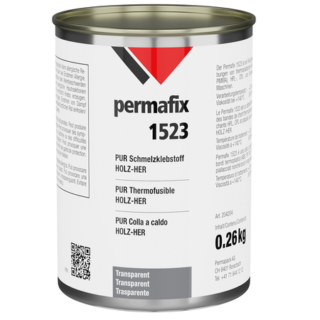 Der Permafix 1523 ist ein feuchtigkeitsvernetzender PUR-Schmelzklebstoff für Verklebungen von thermoplastischen Kantenbändern (ABS, PP, PVC, PET, Melamin und PMMA), HPL-, CPL- und Furnierkanten sowie Massivholzkanten. Dieser Kantenleim verfügt über eine kurze Abbindezeit, eine hohe Anfangshaftung sowie eine gute Kälteflexibilität und Lösemittelbeständigkeit. Die Patrone ist in einer luftdichten Aludose verpackt. Vor der Verarbeitung muss die Trenneinlage auf dem Patronenboden entfernt werden.