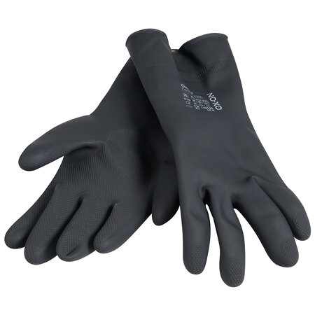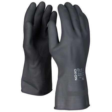 Der OX-ON Chemical Comfort 6300 ist ein schwarzer Chemikalienhandschuh mit Rollkante für alle, die im Bereich Reinigung, Chemie, Fischerei, Labor oder Lebensmittelindustrie beschäftigt sind. Der Arbeitshandschuh ist 30 cm lang und hat eine Dicke von 0,8 mm. Das Modell besteht aus schwerem Latex, ein Rautenmuster an der Handinnenfläche sorgt für guten und sicheren Griff. Der Chemical Comfort 6300 bietet dank des Velours im Inneren guten Komfort.